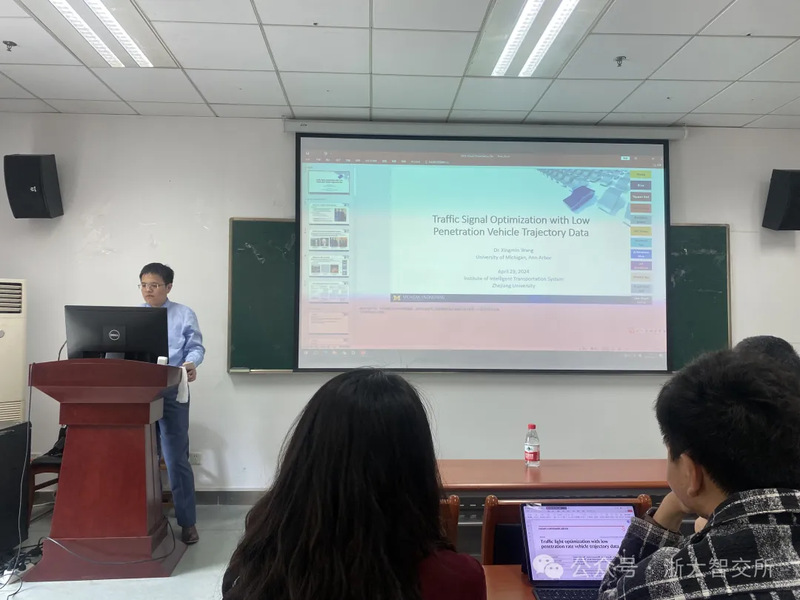 在报告中,王博士介绍了他研究和开发的利用低渗透率网联车轨迹数据的交通信号灯配时优化方法。交叉路口的交通信号灯控制是在现有的基础设施与道路条件下,缓解城市交通拥堵最有效的方式之一。传统的交通信号控制高度依赖于路侧传感设施,然而受限于高额的安装和维护成本,其并没有大规模应用于交通控制系统中,大多数路口依然运行人工标定的固定配时方案。网联车轨迹数据可以广泛收集自网约车,导航软件等,基本覆盖了每一个交叉路口。虽然有优于传统路侧传感器的空间覆盖率,网联车轨迹数据的主要瓶颈在于其有限的渗透率(通常低于10%)。在这样的挑战下,他们提出了“概率时空图模型”,建立了低渗透率网联车轨迹和点排队模型的映射关系。这个模型可以直接利用低渗透率车辆轨迹构建路口的平均交通状态模型,不依赖于任何路侧传感器,进而对交通信号灯配时进行优化。王博士等人基于这一模型开发了一个高度集成的自动化信号灯优化系统,在与通用汽车公司以及当地交通管理中心的合作下,在密歇根州伯明翰市进行了全城的落地测试,测试结果显示主要干线的通行延误和停车次数显著降低。